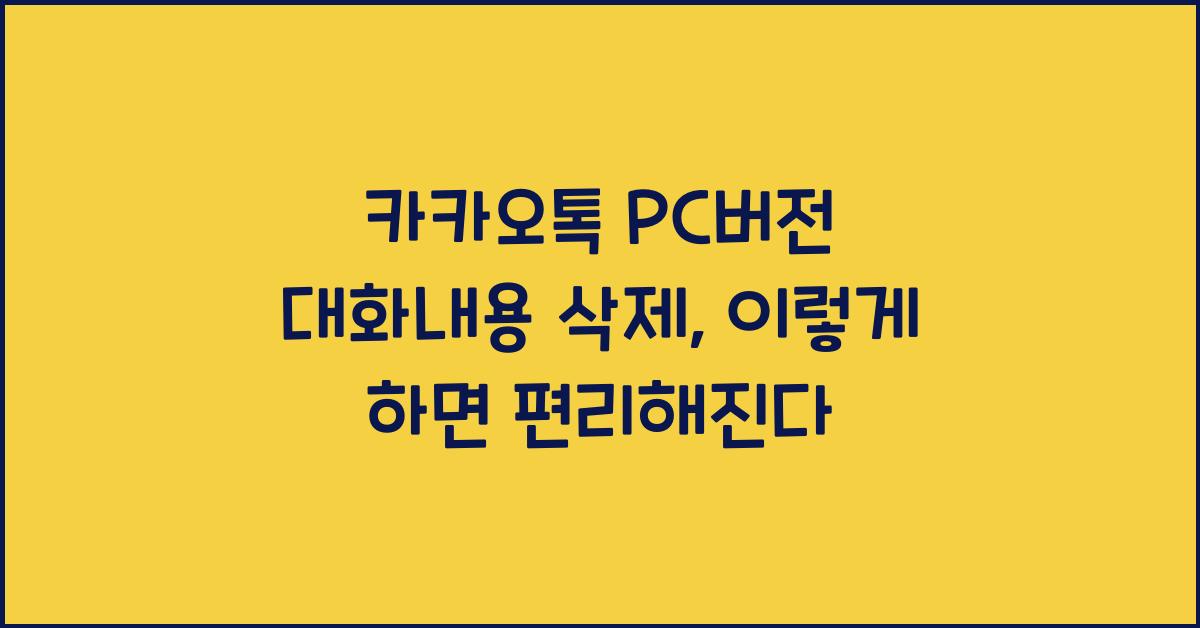 카카오톡 PC버전 대화내용 삭제의 필요성카카오톡은 많은 사람들이 소통하는 유용한 도구이지만, 때때로 대화내용이 쌓여 고민이 될 때가 있습니다. 카카오톡 PC버전 대화내용 삭제는 단순히 불필요한 정보를 지우는 것 이상으로, 공간을 확보하고 마음의 짐을 덜어주는 아주 중요한 요소입니다. 대화내용이 늘어나면 시스템이 느려질 수 있고, 중요한 메시지를 찾기 힘들어질 수 있습니다. 따라서 주기적으로 대화내용을 정리하는 것은 스마트한 선택입니다.카카오톡 pc버전 대화내용 삭제 더 알아보기우리가 일반적으로 카카오톡을 이용하는 이유는 친구, 가족 그리고 동료와의 소통이죠. 하지만, 여러 대화가 쌓이다 보면 그 안에서 의도치 않은 대화 내용을 발견하게 됩니다. 이런 문제는 다양하게 발생할 수 있으며, 그것이 바로 카카오..