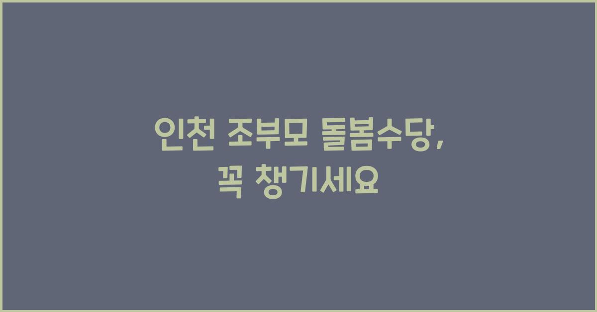 인천 조부모 돌봄수당의 중요성안녕하세요! 요즘 아이를 키우는 부모님들은 정말 힘든 시간을 보내고 계시죠? 맞벌이 부모 또는 아이를 혼자 돌봐야 하는 부모들에게는 도움이 절실한 시대입니다. 그런 분들을 위해 인천시는 조부모 돌봄수당을 통해 아이 돌봄을 지원하고 있습니다. 이 수당은 단순한 금전적인 지원을 넘어 조부모와 손주 간의 따뜻한 유대관계를 쌓는 기회가 되어 줍니다.인천 조부모 돌봄수당 더 알아보기조부모가 손주를 돌보는 것은 단순히 babysitter의 역할을 넘어서, 가족 간의 사랑과 정을 깊이 나누는 시간을 제공합니다. 인천 조부모 돌봄수당이 그 역할을 더욱 풍부하게 만들어 주죠. 이 수당을 통해 더 많은 가족들이 함께 행복한 순간을 공유할 수 있게 됩니다. 아이들은 조부모에게서 많은 사랑을 받고..