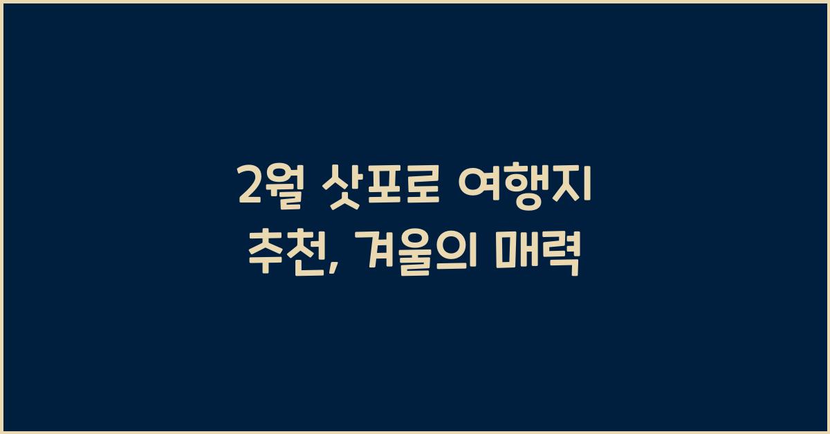 겨울의 로맨스, 삿포로의 매력2월은 삿포로에서의 겨울 여행이 가장 매력적인 시점입니다. 이 시기, 삿포로는 눈으로 뒤덮여 마치 동화 속 세상처럼 변신합니다. 화이트 크리스마스의 그 감동을 느끼며, 눈밭에서의 즐거운 활동과 함께 따뜻한 온천을 즐길 수 있는 기회가 가득합니다. 여러분도 이렇게 매력적인 겨울을 삿포로에서 만끽해 보세요!2월 삿포로 여행지 추천 더 알아보기또한, 삿포로의 겨울은 그야말로 축제의 연속입니다. 매년 열리는 삿포로 눈축제는 세계적으로도 유명하여, 수많은 관광객이 방문합니다. 이 축제에서 만들어진 아름다운 눈 조각들은 정말 환상적이며, 감탄을 자아내기도 하죠. 무엇보다도, 여러분이 삿포로를 찾게 되는 이유 중 하나는 바로 이 눈축제 때문이 아닐까 싶습니다.삿포로의 겨울은 가족, 친구,..